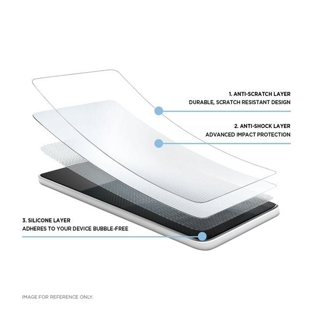 Mehrschichtiger SchutzDas dreischichtige Design besteht aus einer Anti-Scratch-, einer Anti-Shock- und einer Silikonschicht zum Schutz Ihres Geräts. Die Anti-Scratch-Schicht ist langlebig und kratzfest, die Anti-Shock-Schicht bietet fortschrittlichen Aufprallschutz, während die Silikonschicht dafür sorgt, dass die Displayschutzfolie blasenfrei auf Ihrem Display haftet.