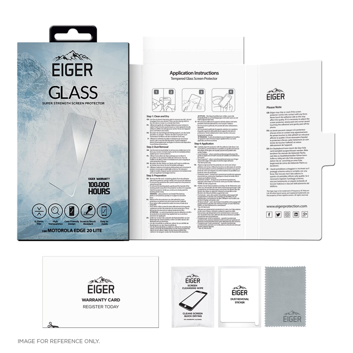 100‘000-Stunden-Eiger-GarantieEiger setzt auf Qualität und bietet eine 100‘000-Stunden-Garantie (10 Jahre) für Herstellungsfehler, wie Material- und Verarbeitungsfehler. Sie erhalten ein Ersatzprodukt, falls Ihr Eiger Mountain Glass-Displayschutz Mängel aufweisen sollte*.