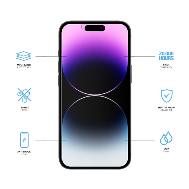 Garantie Eiger de 20'000 heuresEiger mise sur la qualité et offre une garantie de 20'000 heures (2 ans) contre les défauts de fabrication, comme les défauts de matériel et de finition. Vous recevrez un produit de remplacement si votre protection d'écran Eiger Mountain Glass présente des défauts*.
