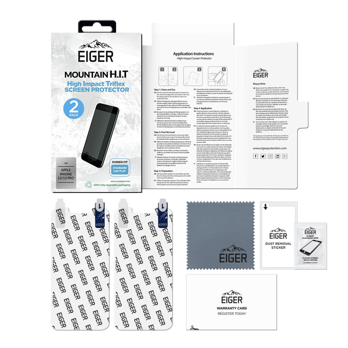 Garanzia Eiger di 20.000 oreEiger si impegna a garantire la qualità e offre una garanzia di 20.000 ore (2 anni) per i difetti di fabbricazione, quali materiale e lavorazione. Riceverete un prodotto sostitutivo se la vostra protezione per lo schermo Eiger Mountain Glass è difettosa*.